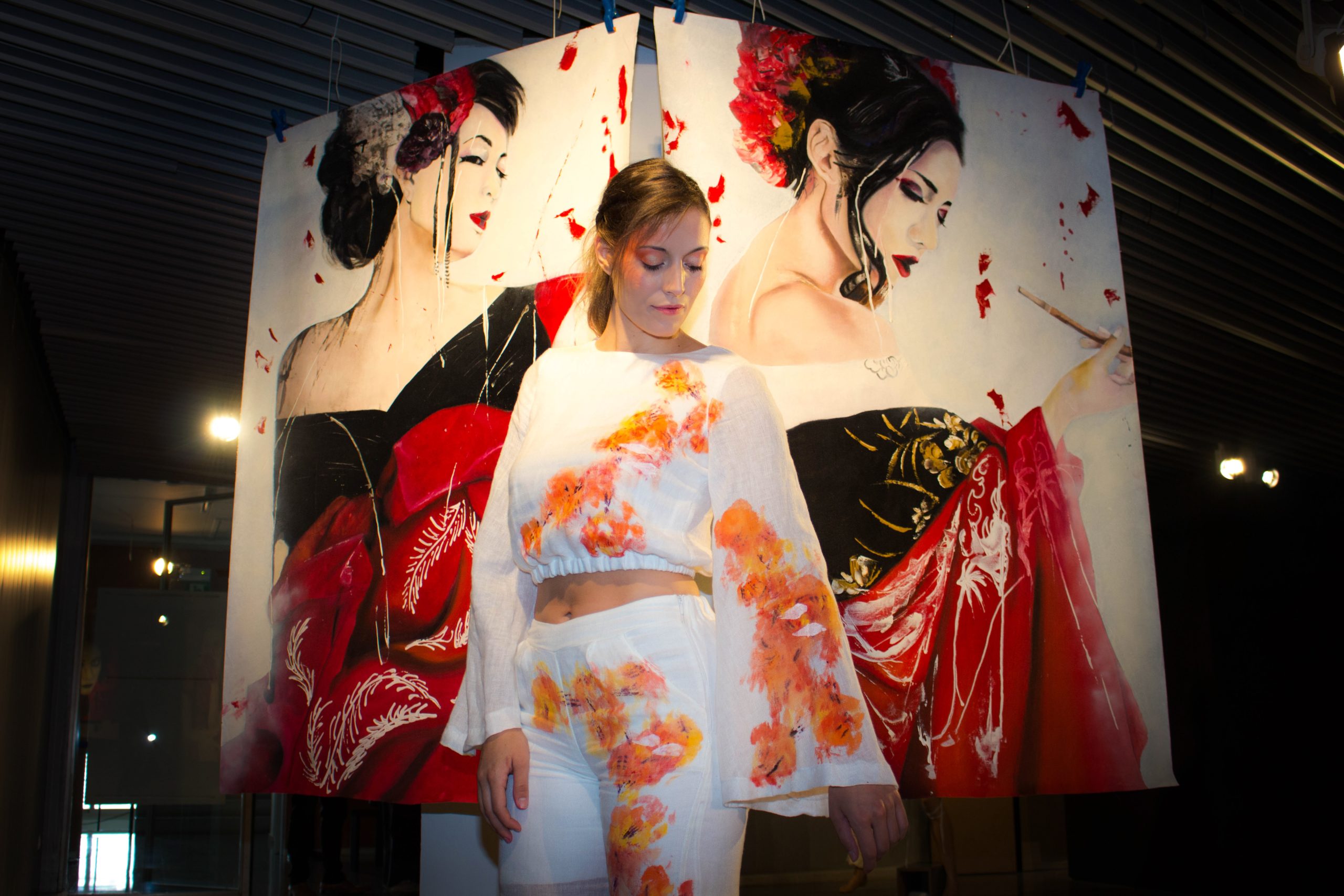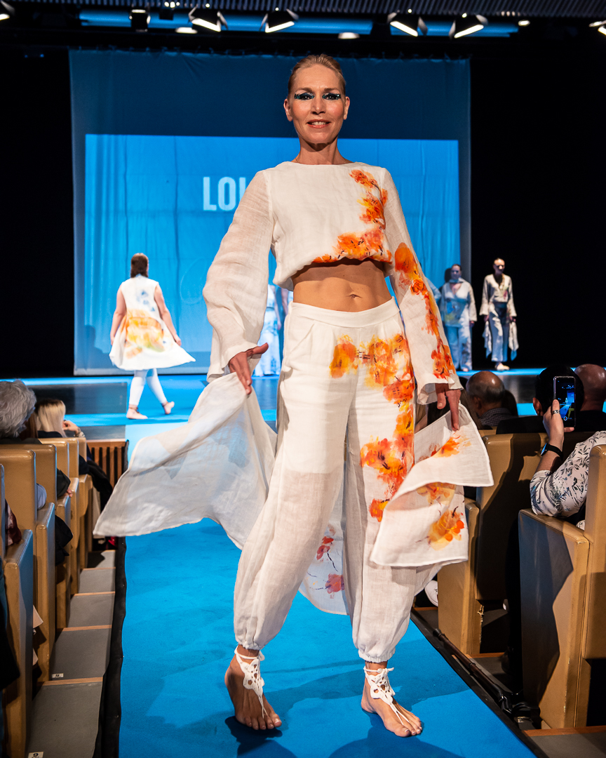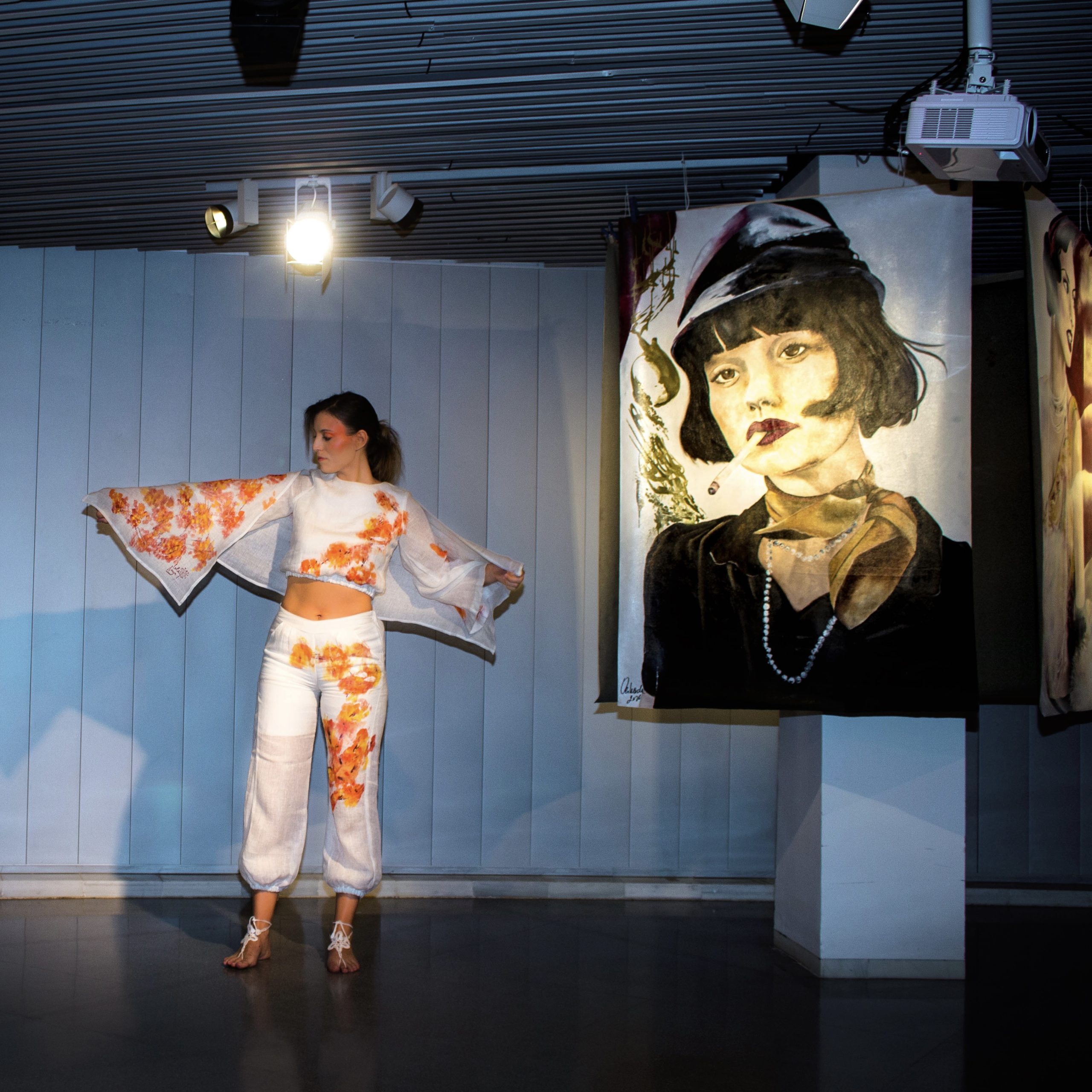 Un conjunto de pantalón cogido al tobillo con cómodos bolsillos laterales. El top de cuello cerrado con amplias mangas acampanades, se frunce a la cintura para dar más comodidad al look.