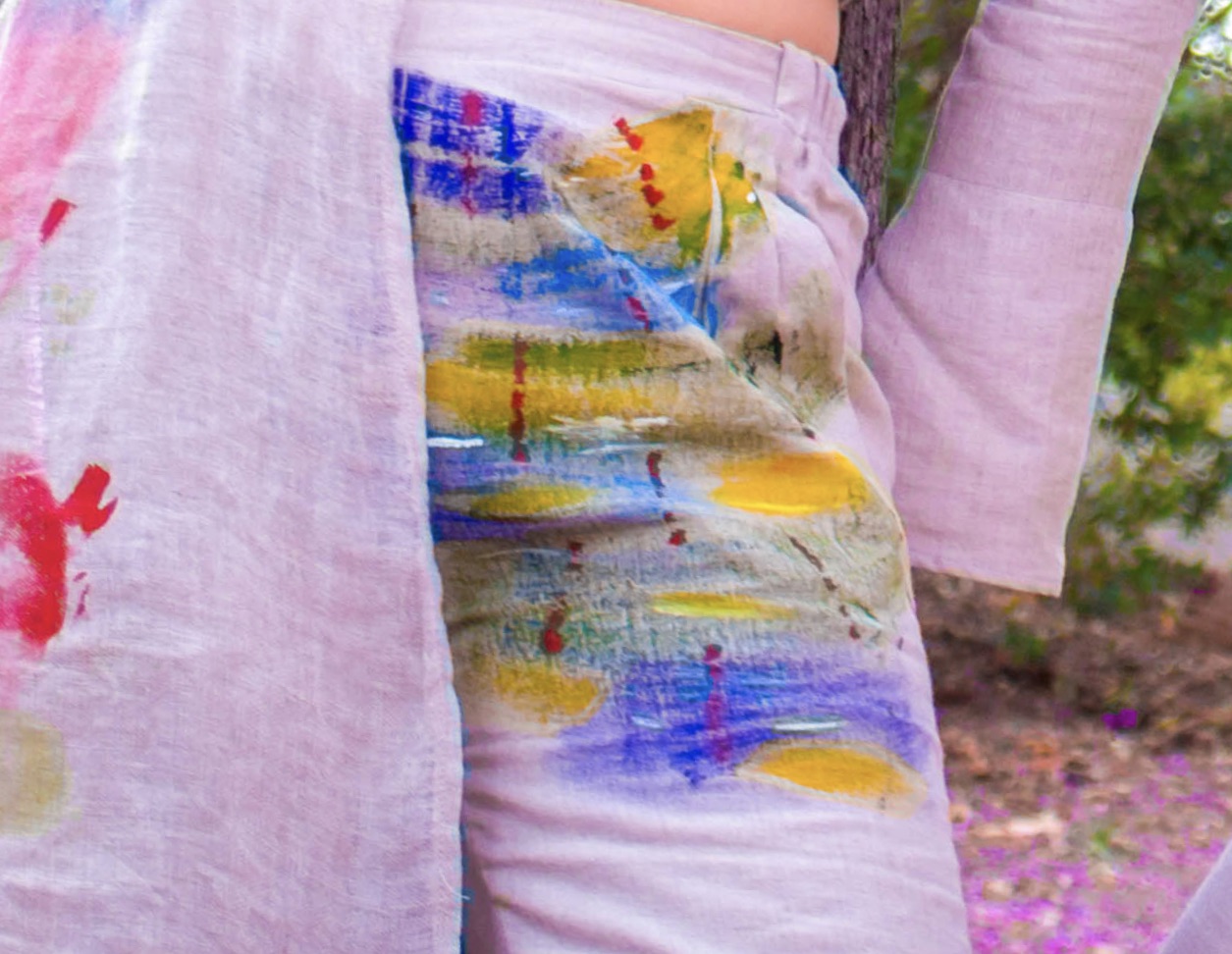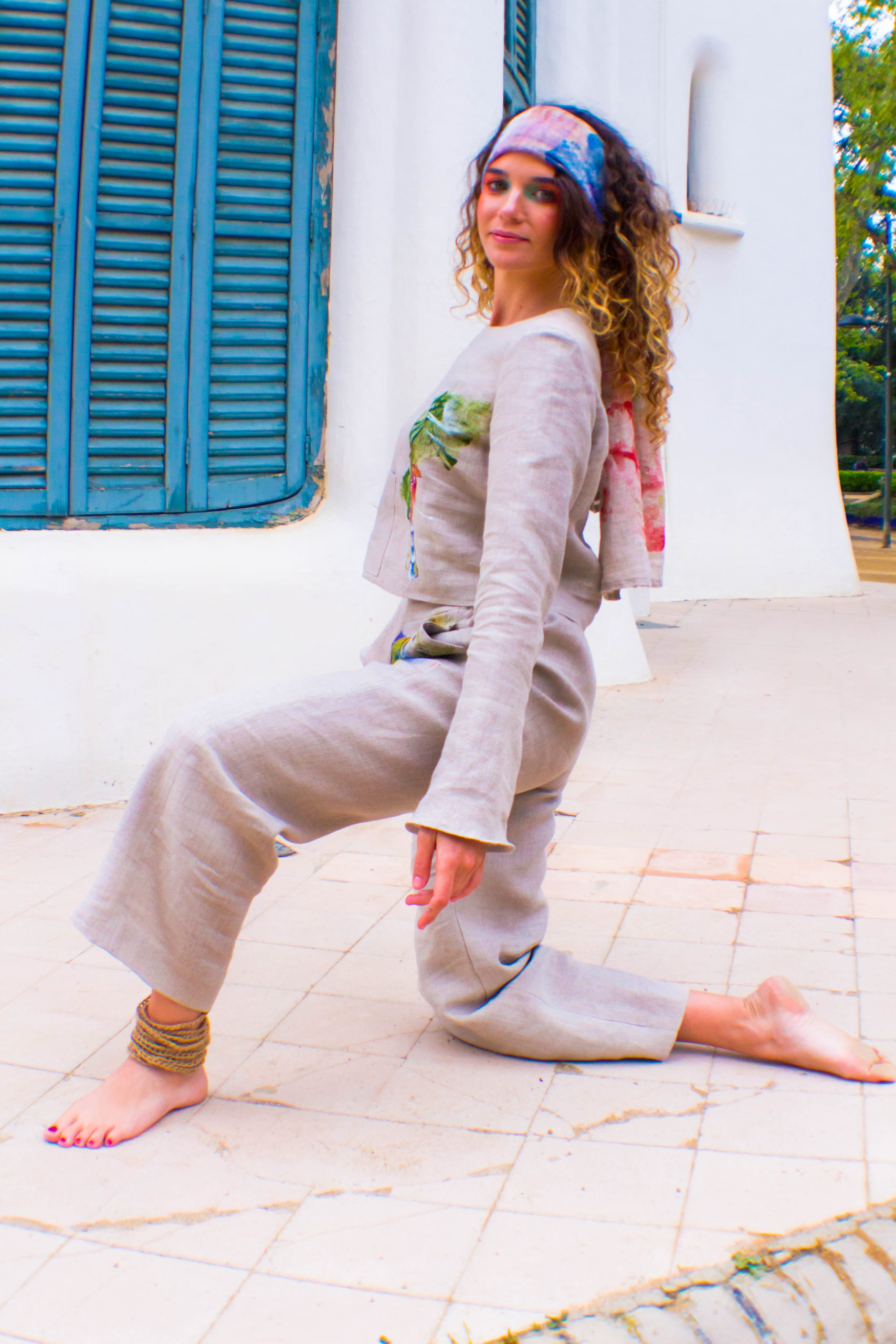 Podríamos decir que lo más informal de la colección Thiancoumalal es este conjunto Ewok. Un amplio pantalón de corte por encima del tobillo, cómodos bolsillos y un top de corte a la altura de la cintura, te permiten esa libertad de movimiento que necesitas en tu día a día. Ewok te libera de estereotipos marcados. Un look original y muy atractivo, una emoción que te arraiga a la tierra permitiéndote a la vez ser tú misma, auténtica, fresca y natural.